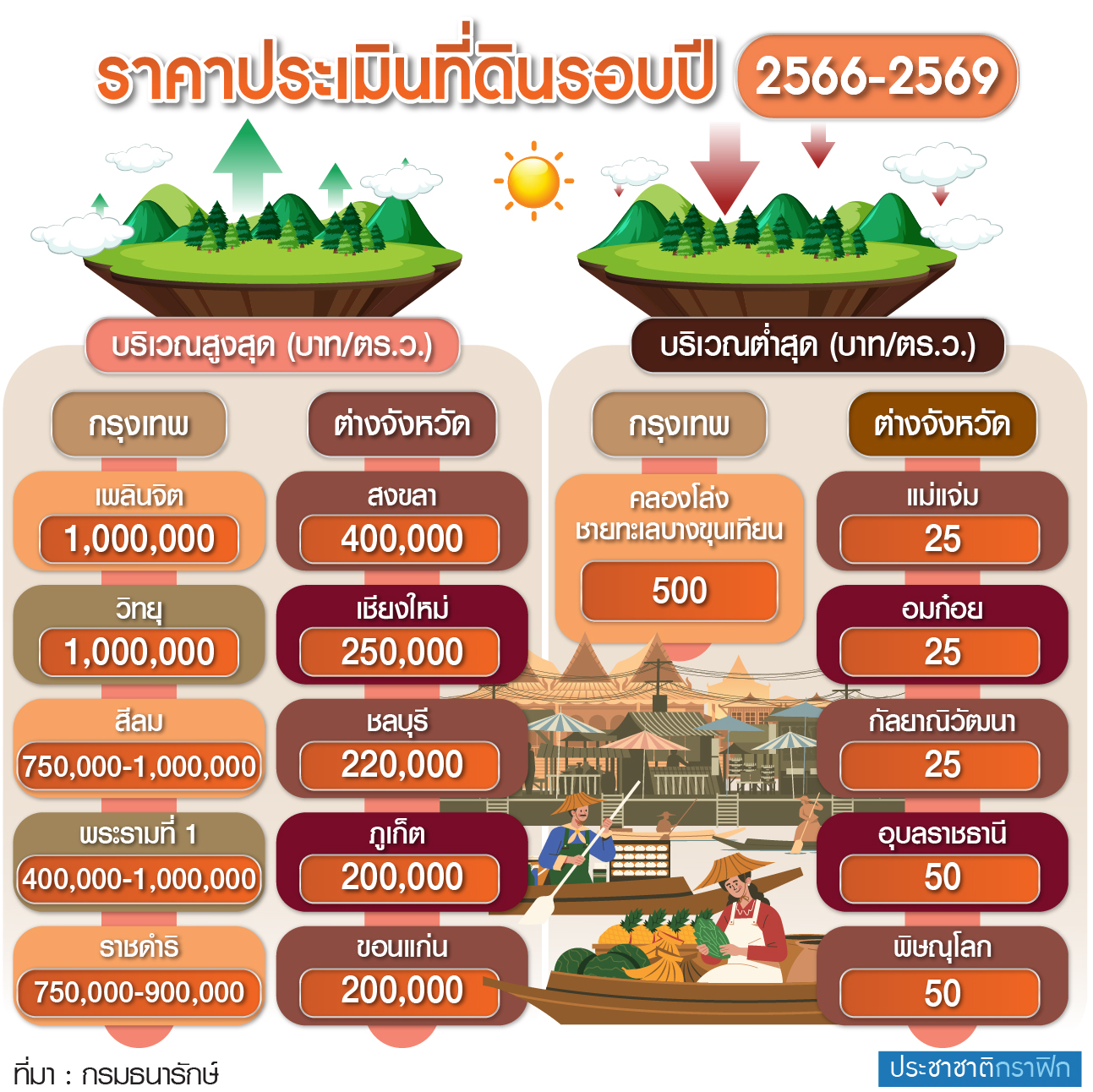 กรมธนารักษ์เขย่าราคาประเมินที่ดิน 37 ล้านแปลงทั่วประเทศ คาดปรับขึ้น 15% เริ่มใช้ 1 ม.ค. 2570-2573 เผยราคาเดิม 4 ถนนหลัก สีลม เพลินจิต พระราม 1 วิทยุ พุ่งทะลุวาละ 1 ล้านบาท แพงสุดในไทย ที่ดินราคาถูกสุดที่อมก๋อย เชียงใหม่ วาละ 25 บาท ตั้งเป้าปรับราคาใกล้เคียงกับการซื้อขายจริง ซึ่งจะเพิ่มรายได้เข้ารัฐมากขึ้น เอกชนมองสภาพเศรษฐกิจตอนนี้ยังไม่เอื้อ หวังรัฐขยายมาตรการลดค่าโอน-ภาษี จับตาเศรษฐีที่ดินแห่ขาย ปล่อยเช่า ลดภาระภาษี