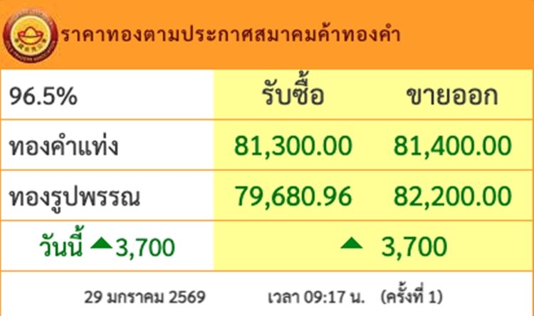 ราคาทองวันนี้ 29 ม.ค.69 สมาคมค้าทองคำ ประกาศ ราคาทองคำวันนี้ พุ่งแรงมาก เทียบราคาปิดวานนี้ เผย ทองรูปพรรณขายออกบาทละ 82,200 บาท