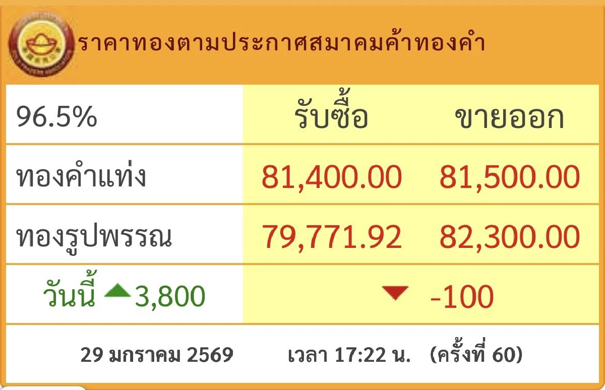 ความเคลื่อนไหวราคาทองคำในประเทศ วันนี้ (29 มกราคม 2569 ) ณ เวลา 17.22 น.ยังคงเคลื่อนไหวอย่าง "ร้อนแรง" โดยตลอดทั้งวันราคาทองมีการปรับเปลี่ยนมากถึง 60 ครั้ง ก่อนจะปิดช่วงบ่ายด้วยการ ปรับขึ้นรวม 3,800 บาท