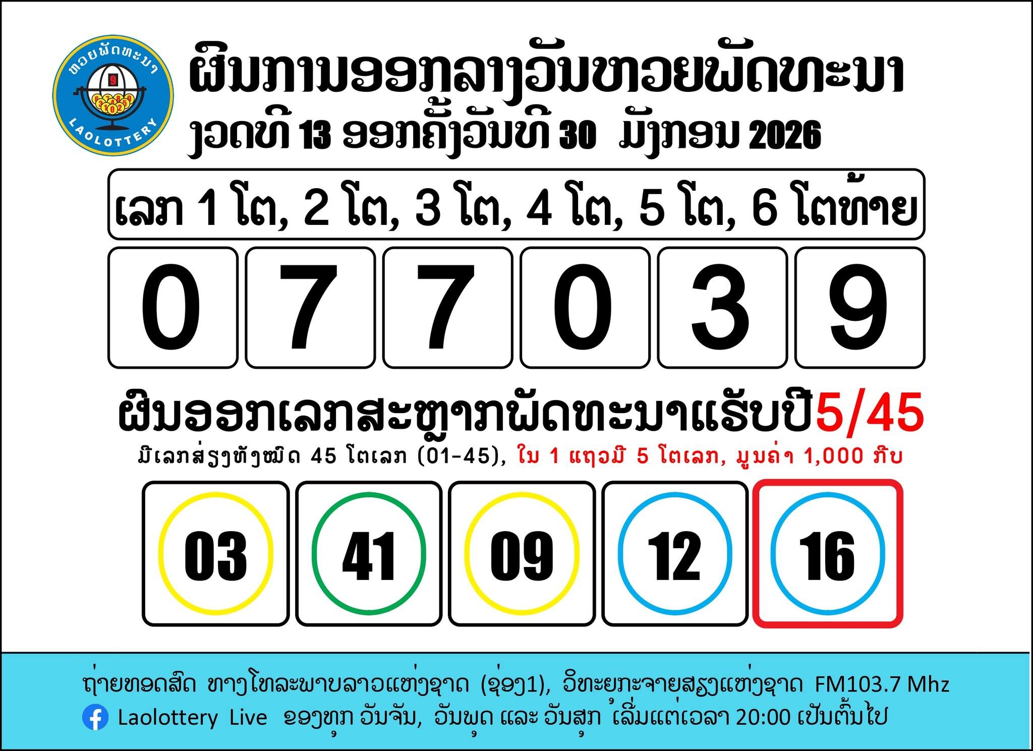 หวยลาววันนี้ งวดประจำวันที่ 30 มกราคม 2569 ผลหวยพัฒนาล่าสุด ตรวจรางวัล หวยลาว ออกอะไร
