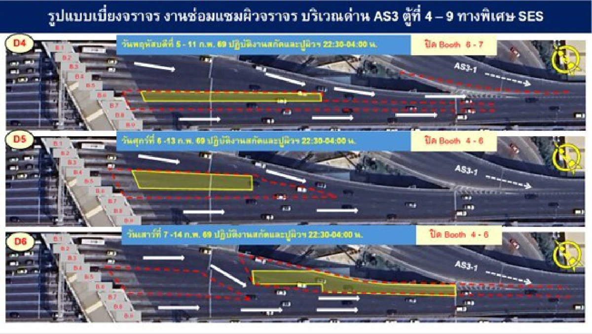 บริษัท ทางด่วนและรถไฟฟ้ากรุงเทพ จำกัด (มหาชน) หรือ BEM ประชาสัมพันธ์แจ้งเบี่ยงการจราจร บริเวณหลังตู้เก็บเงิน ด่านอโศก 3 ตู้ที่ 4-9 ทางพิเศษศรีรัช เนื่องจากมีความจำเป็นต้องซ่อมแซมผิวจราจร เพื่อความปลอดภัยของผู้ใช้ทาง โดยผู้ใช้ทางยังสามารถสัญจรได้ตามปกติ ในวันที่ 2 – 14 กุมภาพันธ์ 2569 ตั้งแต่เวลา 22.30 – 04.00 น.