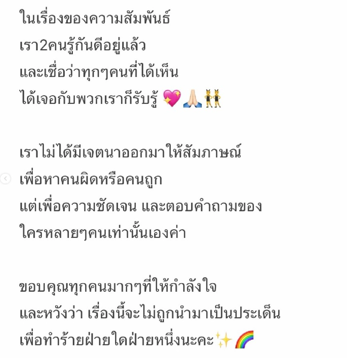 ล่าสุด "นารา เทพนุภา" โพสต์ชี้แจง "มีประเด็นที่อยากชี้แจงค่ะ เพื่อไม่ให้เกิดการตีความ และเข้าใจผิดกันไปมากกว่านี้ สิ่งที่เราต้องการจะสื่อจากประโยคที่บอกว่า "ไม่ได้เรียกว่าคบกัน จะบอกว่าเลิกกันก็คงไม่ใช่" เจตนาของเรา หมายถึง บริบทในสื่อที่เราไม่เคยนิยามกันในเชิงสาธารณะ พอวันนึงที่เราต้องตอบคำถามกับ "สื่อ" เราเลยรู้สึกว่า มันจะแปลกมั้ย ในเรื่องของความสัมพันธ์ เรา 2 คนรู้กันดีอยู่แล้ว และเชื่อว่าทุกๆคนที่ได้เห็น ได้เจอกับพวกเราก็รับรู้ เราไม่ได้มีเจตนาออกมาให้สัมภาษณ์ เพื่อหาคนผิดหรือคนถูก แต่เพื่อความชัดเจน และตอบคำถามของ ใครหลายๆคนเท่านั้นเองค่า ขอบคุณทุกคนมากๆที่ให้กำลังใจ และหวังว่าเรื่องนี้จะไม่ถูกนำมาเป็นประเด็นเพื่อทำร้ายฝ่ายใดฝ่ายหนึ่งนะคะ"