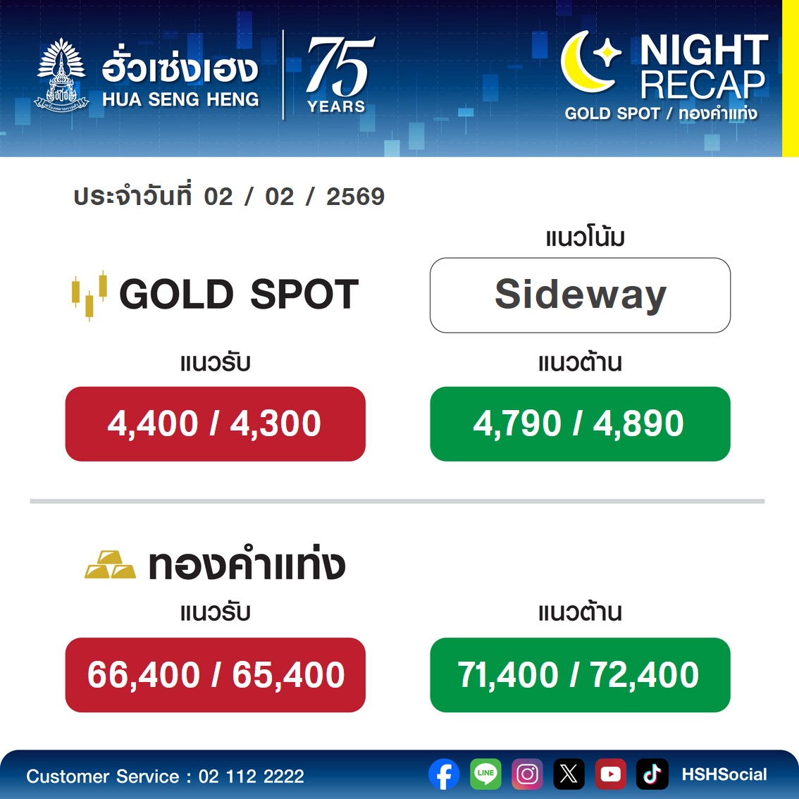 ผู้สื่อข่าวรายงานว่าเพจ MTS GOLD ของห้างทองแม่ทองสุก ชี้ว่าทองคำโลกปรับฐาน โดยเพียง 3 วันทองคำดิ่ง 1,000 เหรียญ ขณะที่เช้านี้ (2 ก.พ.) แตะระดับต่ำสุดใหม่ (นิวโลว์) 4,584 เหรียญ ด้านทองไทยราคาร่วงทดสอบ 70,500 บาท