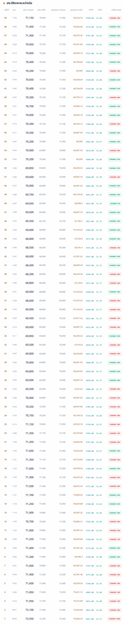 ทองคำแท่งในประเทศ ราคารับซื้ออยู่ที่บาทละ 70,950.00 บาท ขายออกบาทละ 71,150.00 บาท ตามประกาศครั้งที่ 69 ของวันนี้