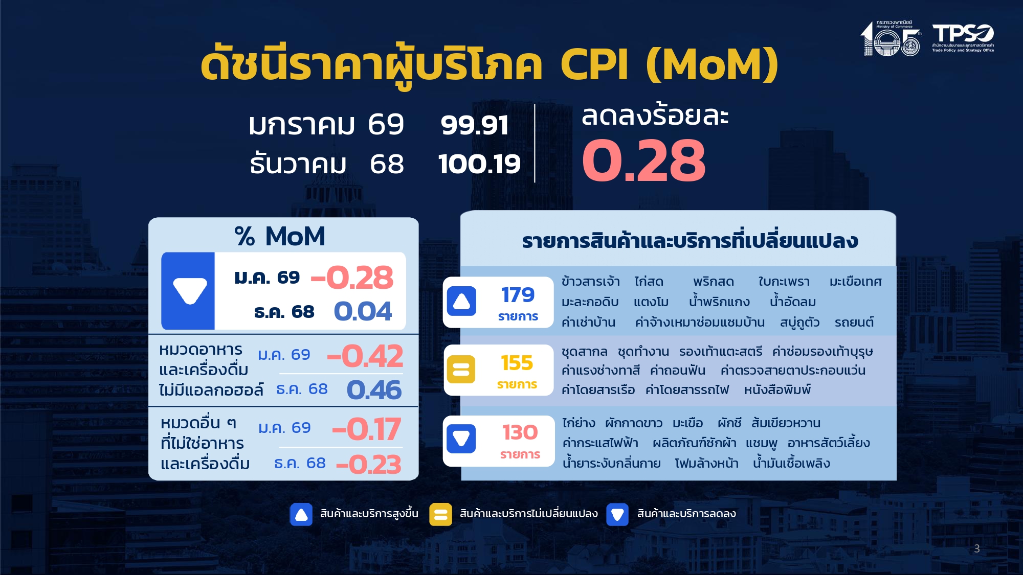 ดัชนีราคาผู้บริโภคทั่วไปเดือนมกราคม 2569 เมื่อเทียบกับเดือนธันวาคม 2568 ลดลงร้อยละ 0.28 (MoM)