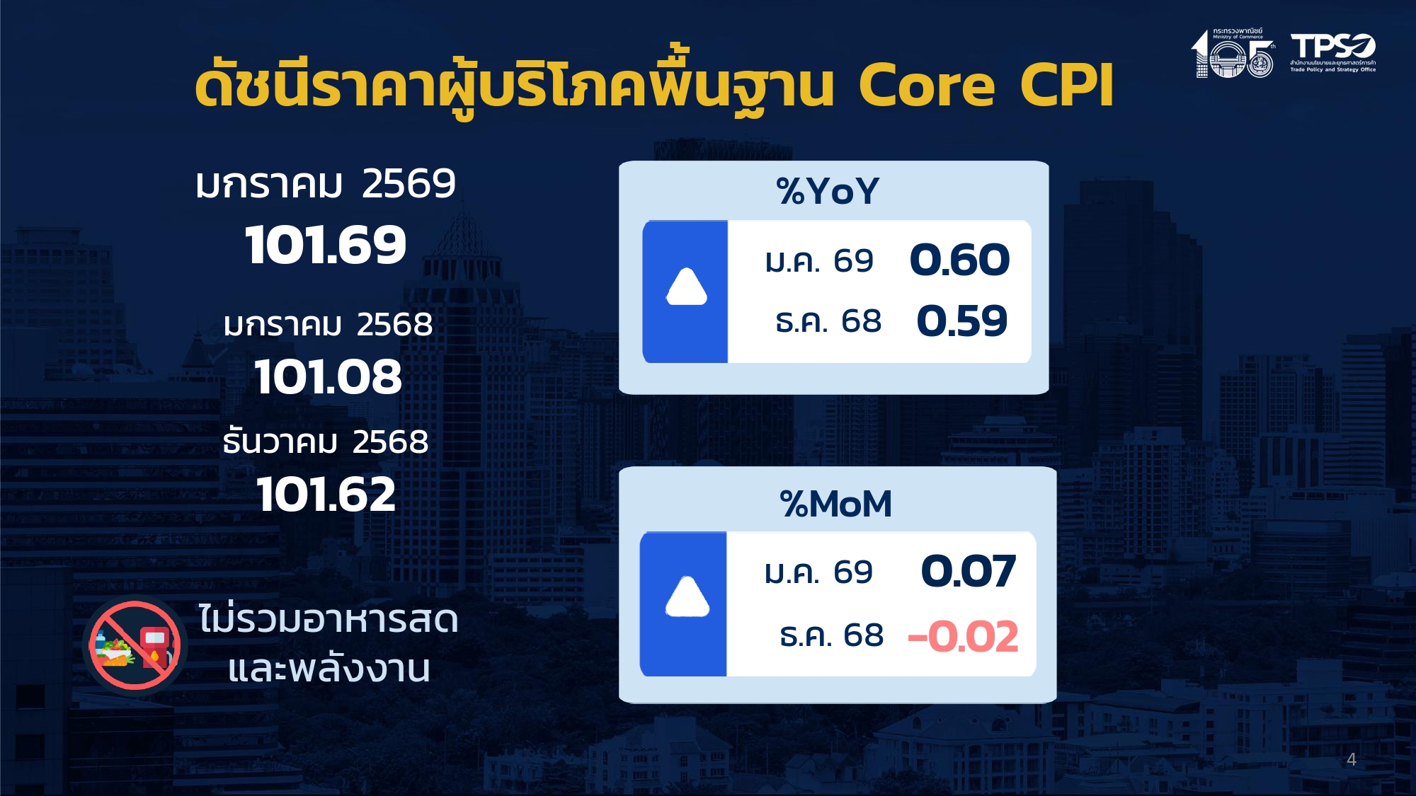 อัตราเงินเฟ้อพื้นฐาน (อัตราเงินเฟ้อทั่วไป เมื่อหักอาหารสดและพลังงานออก) สูงขึ้นร้อยละ 0.60 (YoY) เร่งตัวขึ้นเล็กน้อยจากเดือนธันวาคม 2568 ที่สูงขึ้นร้อยละ 0.59 (YoY)