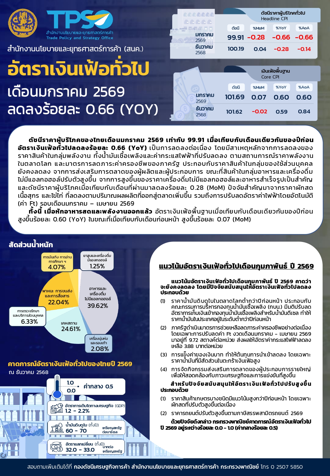 นางสาวณัฐิยา สุจินดา รองผู้อำนวยการสำนักงานนโยบายและยุทธศาสตร์การค้า เปิดเผยว่า ดัชนีราคาผู้บริโภคทั่วไป (เงินเฟ้อ) ของไทย เดือนมกราคม 2569 เท่ากับ 99.91 ทำให้อัตราเงินเฟ้อทั่วไปลดลง 0.66% เมื่อเทียบช่วงเดียวกันของปีก่อน เป็นอัตราลดลงต่อเนื่องเป็นเดือนที่ 10 และคาดว่าเงินเฟ้อไตรมาส 1 ยังลดลง 0.43% แต่ยังไม่ใช่เงินฝืดยังเชื่อว่าเงินเฟ้อจากนี้จะกลับมาบวก สำหรับปัจจัยสำคัญจากการปรับลดลงของราคาสินค้าในกลุ่มพลังงาน ทั้งน้ำมันเชื้อเพลิงและค่ากระแสไฟฟ้าที่ปรับลดลง ตามสถานการณ์ราคาพลังงานในตลาดโลก และมาตรการลดภาระค่าครองชีพของภาครัฐ ประกอบกับราคาสินค้าในกลุ่มของใช้ส่วนบุคคลยังคงลดลง จากการจัดกิจกรรมส่งเสริมการตลาดของผู้ผลิตและผู้ประกอบการ