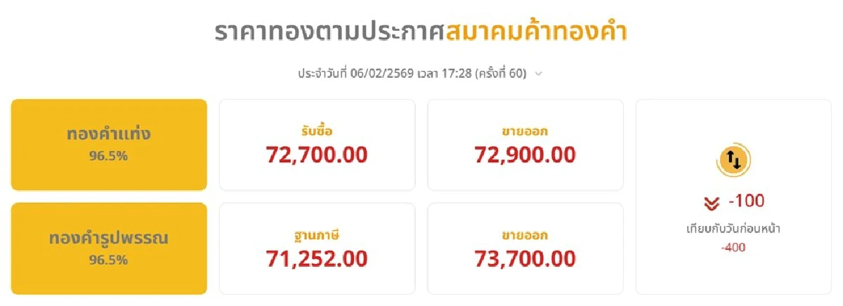 ที่มา : ราคาทองวันนี้ (6 ก.พ. 69) ผันผวนต่อเนื่อง ปิดตลาด ทองลง -400 ทองรูปพรรณขาย 73,700