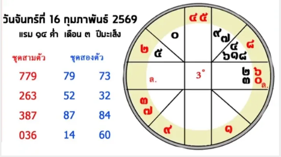 สำหรับหวยงวดที่จะถึงนี้ ก็ออกวันจันทร์ ที่ 16 กุมภาพันธ์ พศ.2569 ซึ่งตรงกับวันแรม 14 ค่ำ เดือน 3 ปีมะเส็ง หลังจากการดูการโคจรของดวงดาวต่างๆ แล้ว สามารถที่จะตีเป็นเลขเด็ดได้ดังนี้