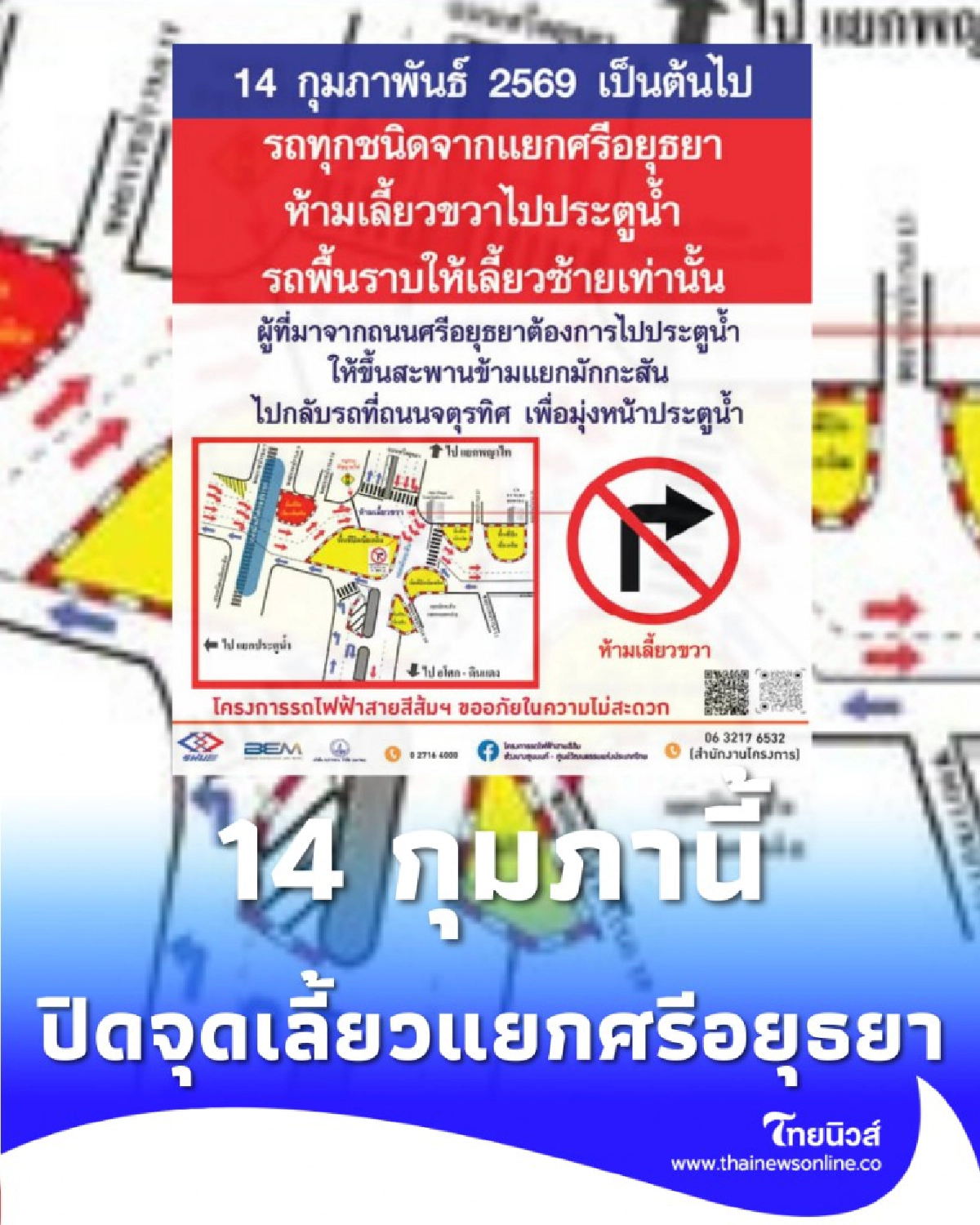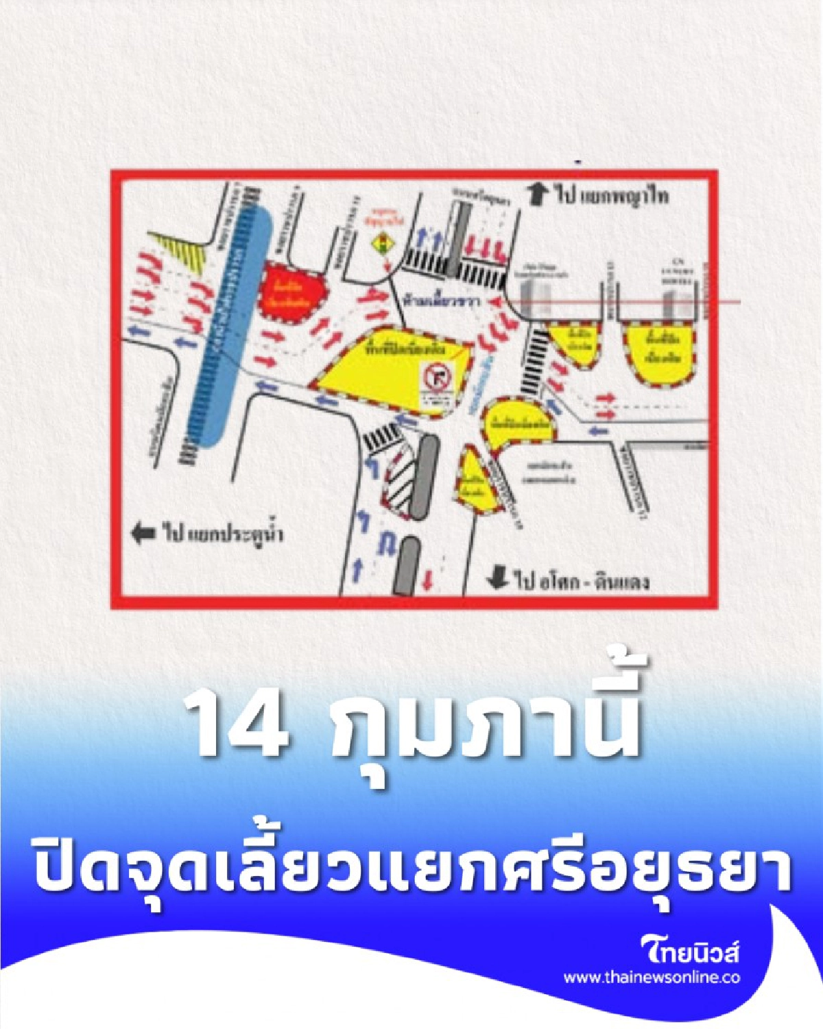 ที่มา : เช็ก 14 กุมภานี้ ปิดจุดเลี้ยวแยกศรีอยุธยา รถทุกชนิดห้ามเลี้ยวขวาไปประตูน้ำ | ไทยนิวส์