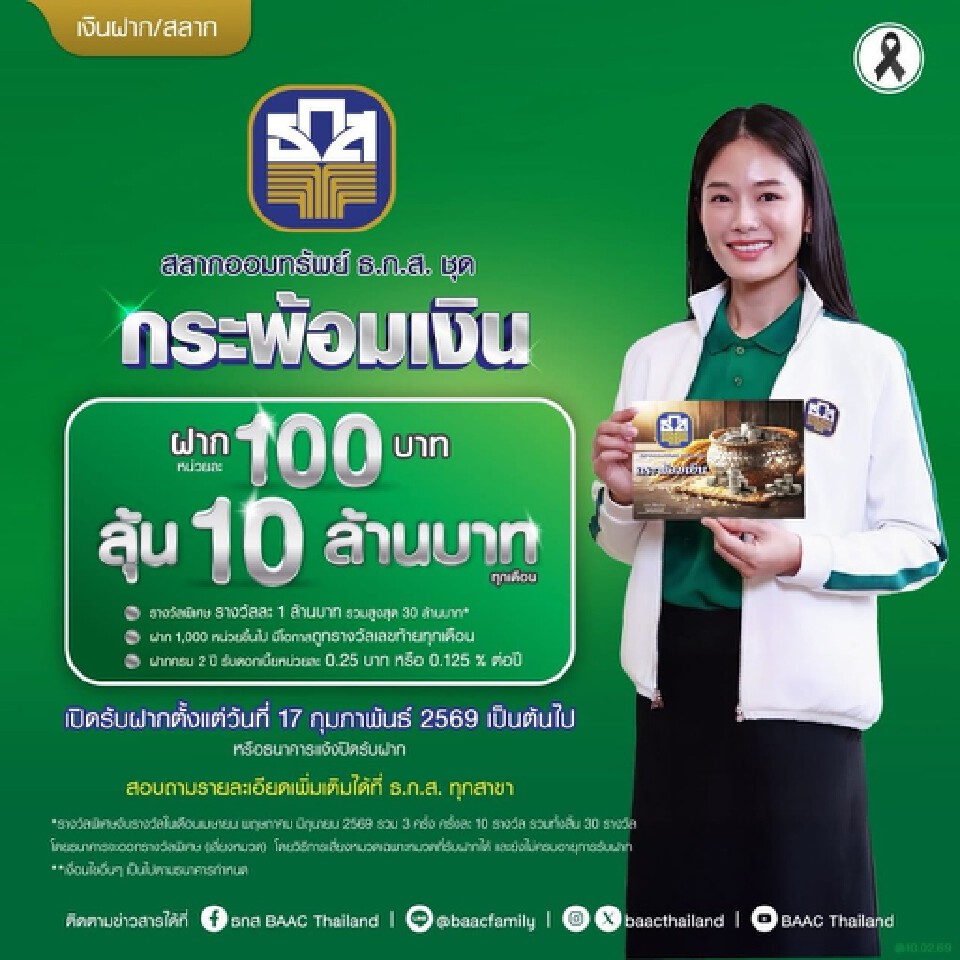 ธนาคารเพื่อการเกษตรและสหกรณ์การเกษตร (ธ.ก.ส.) เตรียมส่งแคมเปญสลากออมทรัพย์ชุดใหม่ "กระพ้อมเงิน" ลุ้นรางวัลที่ 1 มูลค่า 10 ล้านบาท และ "กระพ้อมทอง" ลุ้นรางวัลที่ 1 มูลค่า 20 ล้านบาท โดยธ.ก.ส.จะเปิดรับฝากตั้งแต่วันที่ 17 กุมภาพันธ์ 2569 เป็นต้นไป สำหรับผู้ที่อยากลุ้นโชคใหญ่ สามารถตรวจสอบรายละเอียดแคมเปญโปรโมชันของสลากทั้งสองชุดใหม่ที่นี่