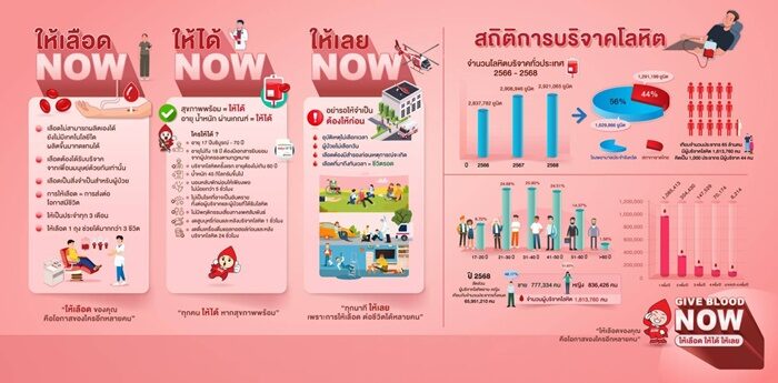 ศูนย์บริการโลหิตแห่งชาติ สภากาชาดไทย ปลุกพลังแห่งการให้ ชวนคนสุขภาพดี บริจาคโลหิตผ่านโครงการ “Give Blood Now – ให้เลือด ให้ได้ ให้เลย” ตลอดปี 2569 เพราะวิกฤตขาดเลือดมีอยู่จริง อย่ารอ หรือลังเลที่จะบริจาคโลหิต สามารถทำได้ทันที ไม่ต้องรอให้มีการร้องขอ
