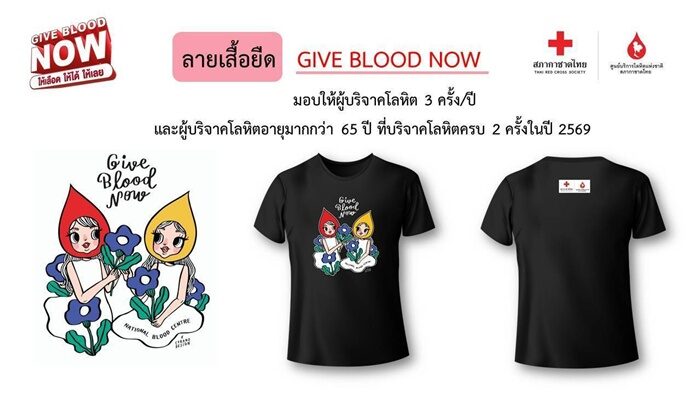 พิเศษ สำหรับผู้บริจาคโลหิตครบ 3 ครั้ง และผู้บริจาคโลหิตที่อายุมากกว่า 65 ปี บริจาคโลหิตครบ 2 ครั้ง ในปี 2569 จะได้รับเสื้อยืด Give Blood Now ลายเส้น Cyrano Design (ไซราโน ดีไซน์) เป็นที่ระลึก