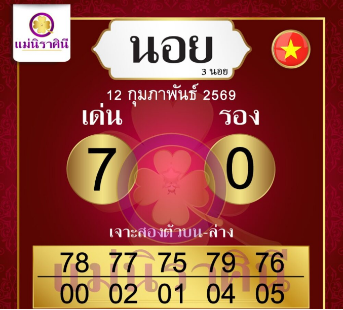 แม่นิราศินีงวดนี้ให้เลขชัดมาก เน้นตัวแรงคือ 7 ที่กำลังขึ้นสถิติต่อเนื่อง ขณะที่ 0 ทำหน้าที่เลขรองและกลายเป็นตัวประกบที่จับคู่แล้วเข้าทรงสวยหลายงวด