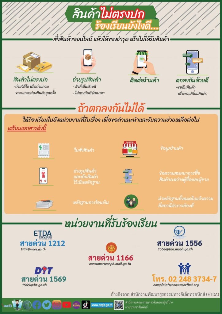 ขณะเดียวกัน กรณีที่ได้ทำการโอนเงินและรับพัสดุมาแล้ว ขณะเปิดพัสดุ แนะนำให้ถ่ายคลิปวิดีโอไว้ทุกครั้ง เพื่อยืนยันสภาพสินค้าภายในว่าใช่ของท่านหรือไม่ สินค้าถูกต้องครบถ้วนหรือไม่ หากพบว่าสินค้าไม่ตรงปกหรือไม่ได้สั่งจริง สามารถติดต่อขอคืนเงินจากผู้ขายได้ทันที และหากไม่สามารถตกลงกันได้ ให้รวบรวมหลักฐาน ได้แก่ ใบสั่งซื้อ ภาพถ่ายสินค้าและบรรจุภัณฑ์ หลักฐานการโอนเงิน ข้อมูลร้านค้า และข้อความสนทนาระหว่างผู้ซื้อกับผู้ขาย เข้าแจ้งความที่สถานีตำรวจใกล้บ้าน หรือร้องเรียนขอคำแนะนำและความช่วยเหลือได้ที่ สายด่วน 1212, สายด่วน 1166, สายด่วน 1556, สายด่วน 1569 และหมายเลขโทรศัพท์ 02-248-3734-7 เพื่อป้องกันและลดความเสี่ยงจากกการถูกหลอกลวงทางออนไลน์