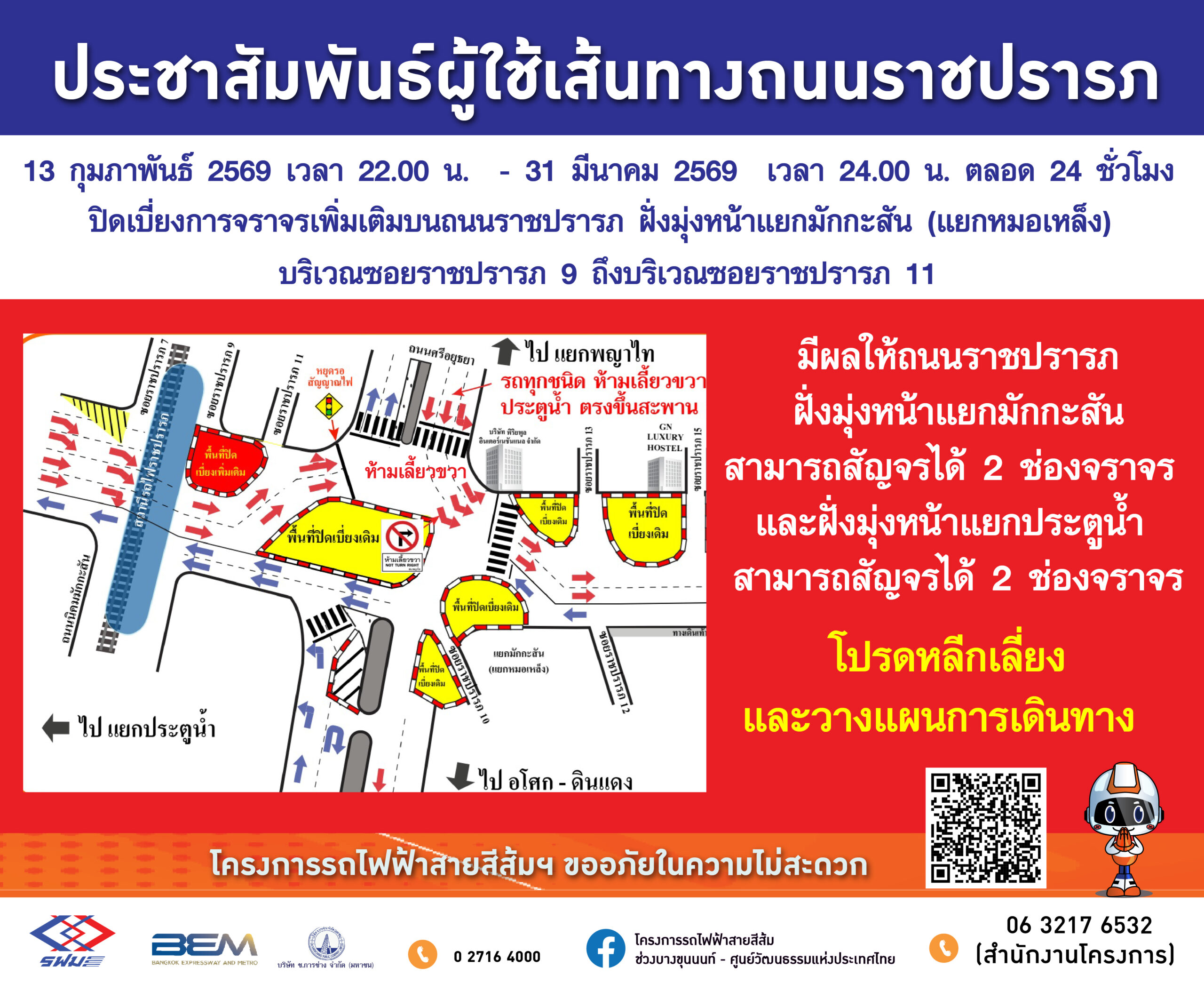 โดยมีแผนจะดำเนินการปิดเบี่ยงจราจรเพิ่มเติม 3 ช่องจราจร ชิดทางเท้า บนถนนราชปรารภ ฝั่งมุ่งหน้าแยกมักกะสัน (แยกหมอเหล็ง) บริเวณซอยราชปรารภ 9 ถึงบริเวณซอยราชปรารภ 11 เพื่อดำเนินงานก่อสร้างกำแพงกันดิน (Diaphragm Wall) ตั้งแต่วันที่ 13 กุมภาพันธ์ 2569 เวลา 22.00 น.-31 มีนาคม 2569 เวลา 24.00 น. ตลอด 24 ชั่วโมง มีผลให้ถนนราชปรารภบริเวณปิดเบี่ยง ฝั่งมุ่งหน้าแยกมักกะสัน สามารถสัญจรได้ 2 ช่องจราจร และฝั่งมุ่งหน้าแยกประตูน้ำ สามารถสัญจรได้ 2 ช่องจราจร และห้ามรถทุกชนิดที่มาจากถนนศรีอยุธยาเลี้ยวขวาไปประตูน้ำ โดยให้ตรงไปขึ้นสะพานแล้วกลับรถที่บึงมักกะสันเท่านั้น