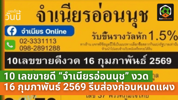 10 เลขขายดี “จำเนียรอ่อนนุช” งวด 16 กุมภาพันธ์ 2569 มาแรงยิ่งกว่าบอลนาทีทดเจ็บ! คอหวยรีบส่องก่อนหมดแผง