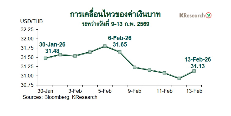 ในวันศุกร์ที่ 13 ก.พ. 2569 เงินบาทปิดตลาดในประเทศที่ 31.13 บาทต่อดอลลาร์ฯ เทียบกับระดับ 31.65 บาทต่อดอลลาร์ฯ ในวันศุกร์ก่อนหน้า (6 ก.พ.) สำหรับสถานะพอร์ตการลงทุนของนักลงทุนต่างชาติระหว่างวันที่ 9-13 ก.พ. 2569 นั้น นักลงทุนต่างชาติซื้อสุทธิหุ้นไทย 31,513 ล้านบาท และมีสถานะอยู่ในฝั่ง Net Inflows เข้าตลาดพันธบัตรไทย 8,105 ล้านบาท (ซื้อสุทธิพันธบัตร 8,115 ล้านบาท หักตราสารหนี้หมดอายุ 10 ล้านบาท)