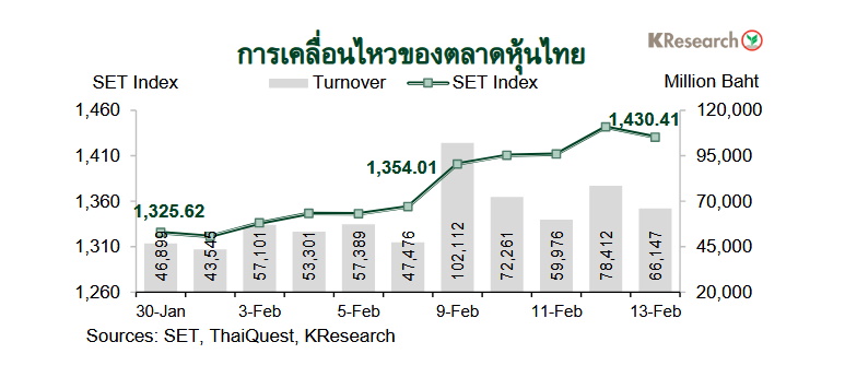ในวันศุกร์ที่ 13 ก.พ. 2569 ดัชนี SET ปิดที่ระดับ 1,430.41 จุด เพิ่มขึ้น 5.64% จากระดับปลายสัปดาห์ก่อน ขณะที่มูลค่าการซื้อขายเฉลี่ยต่อวันอยู่ที่ 75,781.64 ล้านบาท เพิ่มขึ้น 46.40% จากสัปดาห์ก่อน ส่วนดัชนี mai เพิ่มขึ้น 4.93% มาปิดที่ระดับ 218.84 จุด
