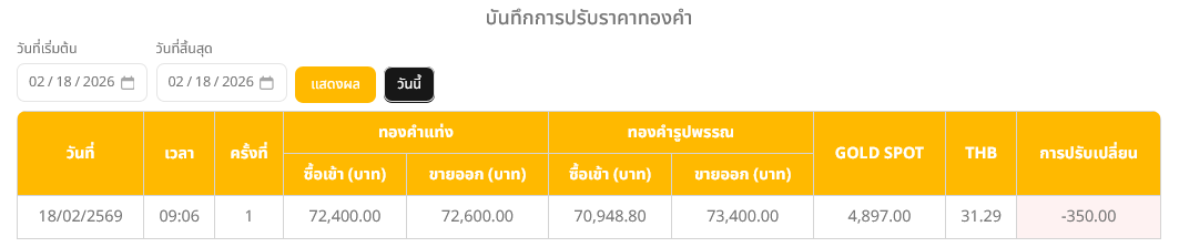 ที่มา : ราคาทองวันนี้ (18 ก.พ. 69) ปรับลง 350 บาท รูปพรรณบาทละ 73,400 บาท