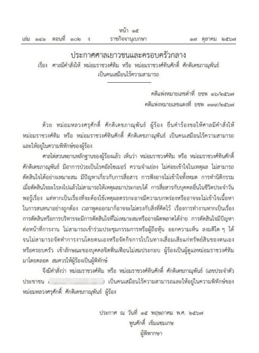 ราชกิจจาฯ เผยแพร่ประกาศ ศาลมีคำสั่งให้ ‘คุณชายทิม’ หม่อมราชวงศ์ทินศักดิ์ ศักดิเดชภาณุพันธุ์ เป็นเสมือน บุคคลไร้ความสามารถ อยู่ในความพิทักษ์ของผู้ร้อง