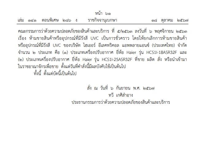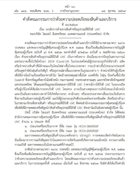 ราชกิจจานุเบกษา เผยแพร่คำสั่ง ยกเลิกการห้ามจำหน่าย เครื่องปรับอากาศ Haier 2 รุ่น ก่อนผ่านการทดสอบแล้ว เป็นไปตามเกณฑ์ที่กำหนด จึงสั่งให้แก้ไขคำสั่งเดิม