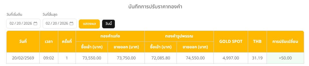 ที่มา : ราคาทองวันนี้ (20 ก.พ. 69) ปรับขึ้น 50 บาท รูปพรรณบาทละ 74,550 บาท