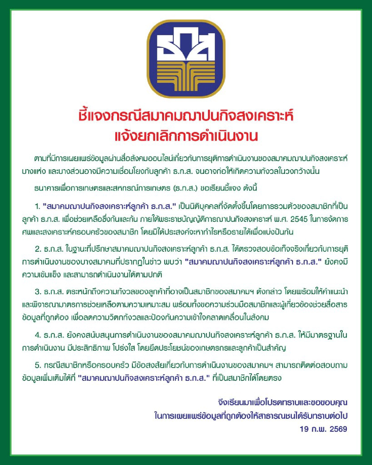ธนาคารเพื่อการเกษตรและสหกรณ์ (ธ.ก.ส.) ชี้แจงกรณีสมาคมฌาปนกิจสงเคราะห์ แจ้งยกเลิกการดำเนินงาน ระบุว่า...