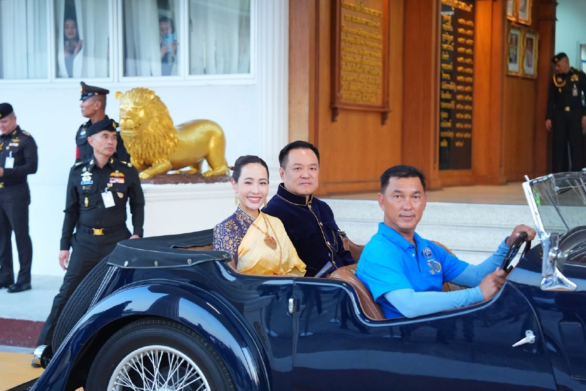 ไฮไลต์ที่ดึงดูดสายตาผู้ร่วมงานคือ นายกรัฐมนตรีและภริยาเดินทางเข้างานด้วยรถหรูโบราณ แต่งกายด้วยชุดไทยอย่างสง่างาม โดยนายกรัฐมนตรีสวมเสื้อกำมะหยี่สีน้ำเงินขลิบดิ้นทองนุ่งโจงกระเบนสีม่วง ส่วนภริยาสวมชุดไทยห่มสไบนุ่งโจงกระเบนสีน้ำเงิน โดยมี น.ส.วิสุดา วิเชียรศิลป์ ว่าที่ สส.กาญจนบุรี พรรคภูมิใจไทย บุตรสาวนายศักดิ์ดา วิเชียรศิลป์ รัฐมนตรีช่วยว่าการกระทรวงมหาดไทย ร่วมเดินทางมาด้วยในที่นั่งด้านหน้า ซึ่งนายกรัฐมนตรีได้หยอกล้อกับผู้สื่อข่าวว่า "ให้มาเป็นบอดี้การ์ด"