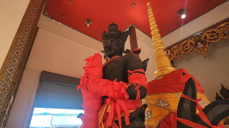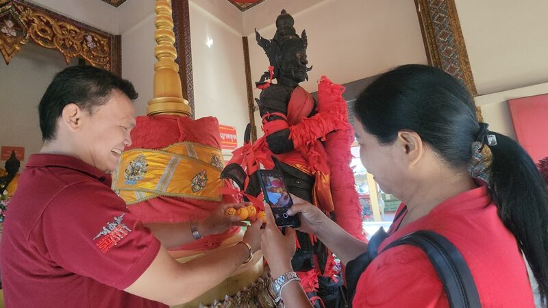 จากการสอบถาม นายสมโชค อายุ 49 ปี หนึ่งในผู้ที่เดินทางมากราบขอพรองค์ท้าวเวสสุวรรณโดยได้เข้ามาผูกผ้าแดงไว้กับกระบองยันกาย ซึ่งมาพร้อมกับภรรยา ได้ชักชวนกันมาขอพรกับท้าวเวสสุวรรณ
