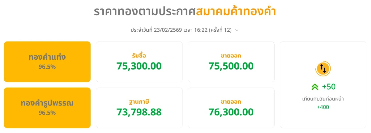 "ราคาทองคำวันนี้" (23 ก.พ. 69) อัปเดต ราคาทองล่าสุด โดย สมาคมค้าทองคำ รายงาน ราคาทองคำ ตลอดทั้งวันมีการปรับ 12 ครั้ง ประกาศราคาล่าสุด เมื่อเวลา 16:22 น. ทำให้ ราคาทอง มีการปรับตัวเพิ่มขึ้น 400 บาทเมื่อเทียบกับ ราคาซื้อขาย ทองคำ เมื่อสุดสัปดาห์ที่ผ่านมา (20 ก.พ. 69)