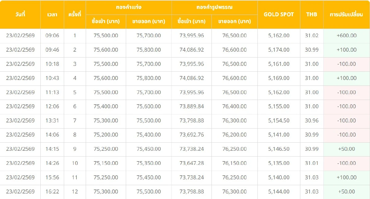 ราคาทองคำวันนี้ (23 ก.พ. 69) ทั้งวันปรับ 12 ครั้ง อัปเดต ราคาทอง ล่าสุด หลังปิดตลาด เช็กเลย ราคาทองคำแท่ง ราคาทองรูปพรรณ ขายออก-รับซื้อ