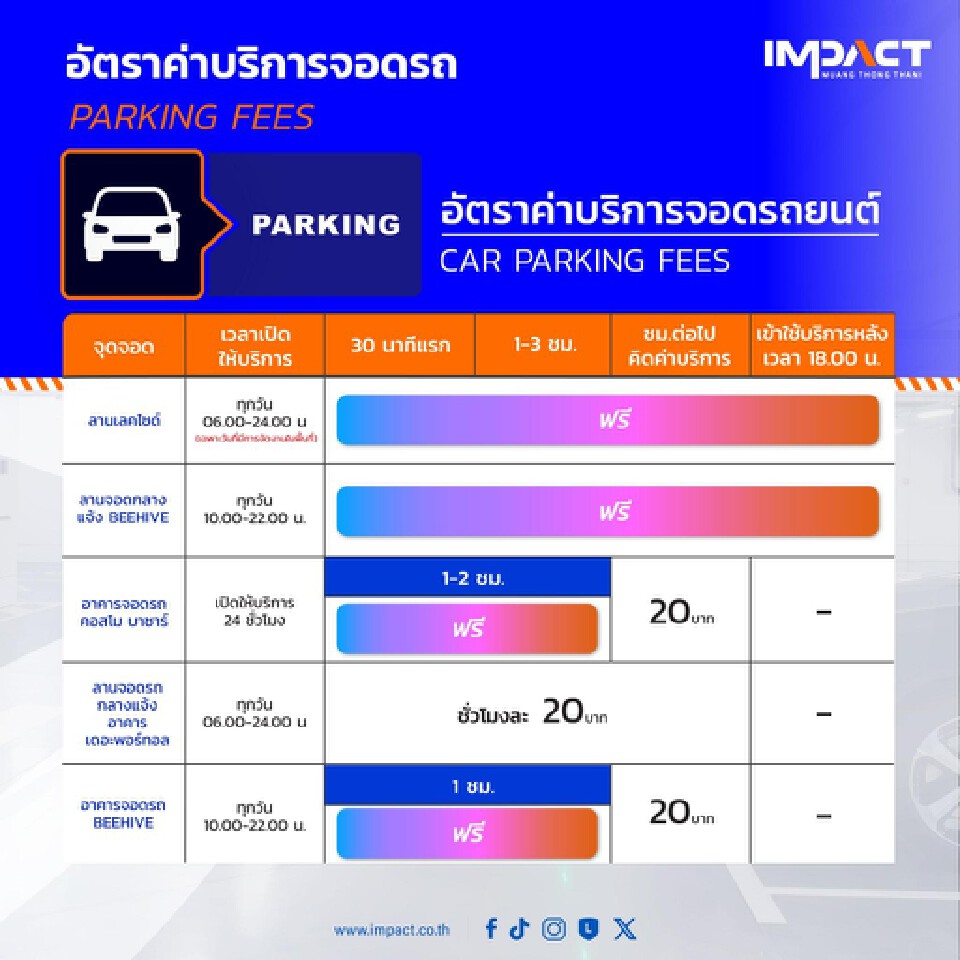 อิมแพ็ค เมืองทองธานี มีสถานที่จอดรถพร้อมให้บริการ ทั้งอาคารจอดในร่มและลานกลางแจ้ง สามารถรองรับรถยนต์และรถจักรยานยนต์ได้มากกว่า 12,000 คัน
