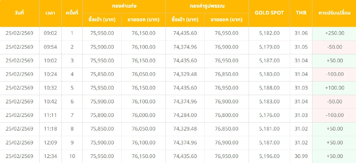 ราคาทองคำวันนี้ (25 ก.พ. 69) ทั้งวันปรับ 20 ครั้ง อัปเดต ราคาทอง ล่าสุด หลังปิดตลาด เช็กเลย ราคาทองคำแท่ง ราคาทองรูปพรรณ ขายออก-รับซื้อ