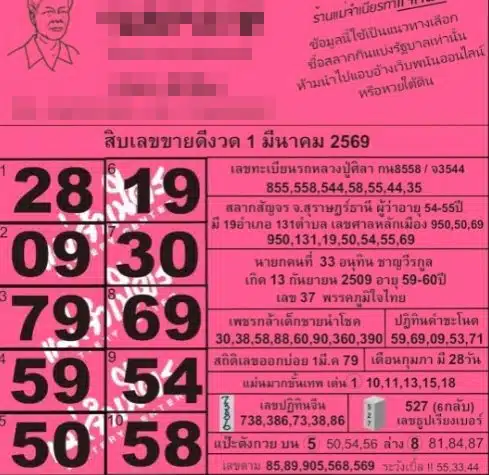 เปิดโพยหวยใบชมพู คัด 10 อันดับเลขเด็ดขายดี บนแผง แม่จำเนียร งวด 1 มีนาคม 2569 ขานรับสลากสัญจร จ.สุราษฎร์ธานี รวมไว้ทุกสำนัก-เหตุการณ์สำคัญ