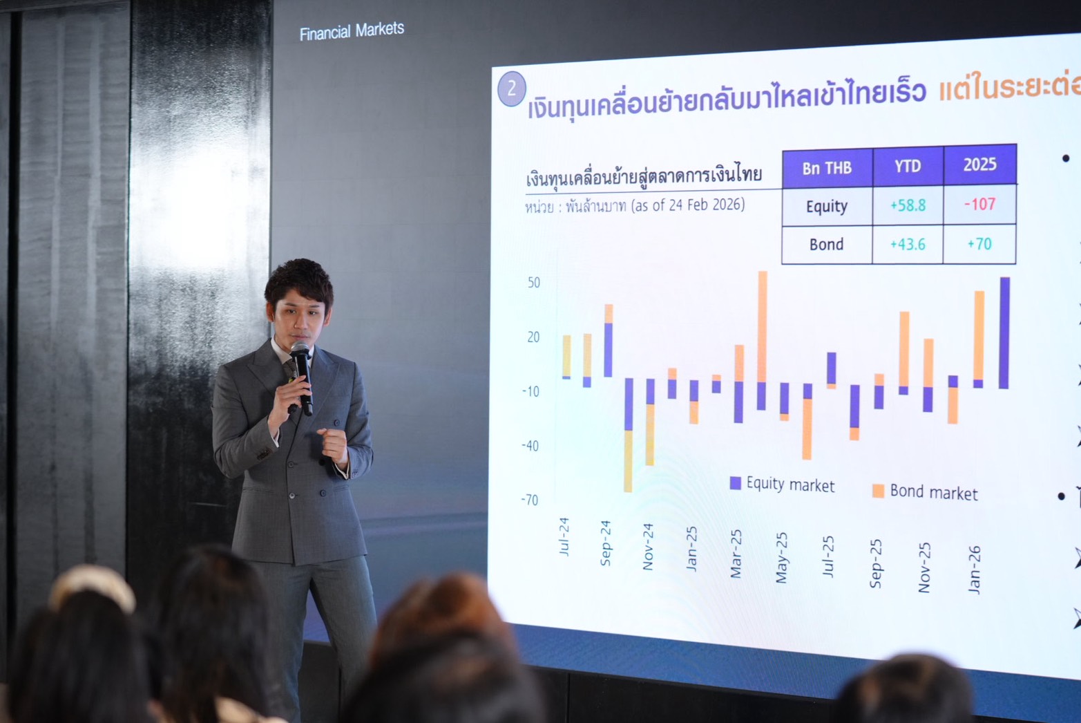 ขณะที่กระแสเงินทุนเคลื่อนย้าย (Fund Flow) ในปีนี้ ประเมินว่าเงินไหลเข้าสุทธิ หลังจากตลาดมีความเชื่อมั่นมากขึ้น โดยตัวเลขในช่วง 2 เดือนแรกของปีนี้เงินไหลเข้าแล้ว 1 แสนล้านบาท ถือว่าค่อนข้างสูงเมื่อเทียบกับปีก่อน ซึ่งการไหลเข้าในช่วงเดือนมกราคมในตลาดพันธบัตรราว 4.3 หมื่นล้านบาท และกุมภาพันธ์ไหลเข้าตลาดหุ้น 5.4 หมื่นล้านบาท ภายหลังจากมีความชัดเจนในการเลือกตั้ง