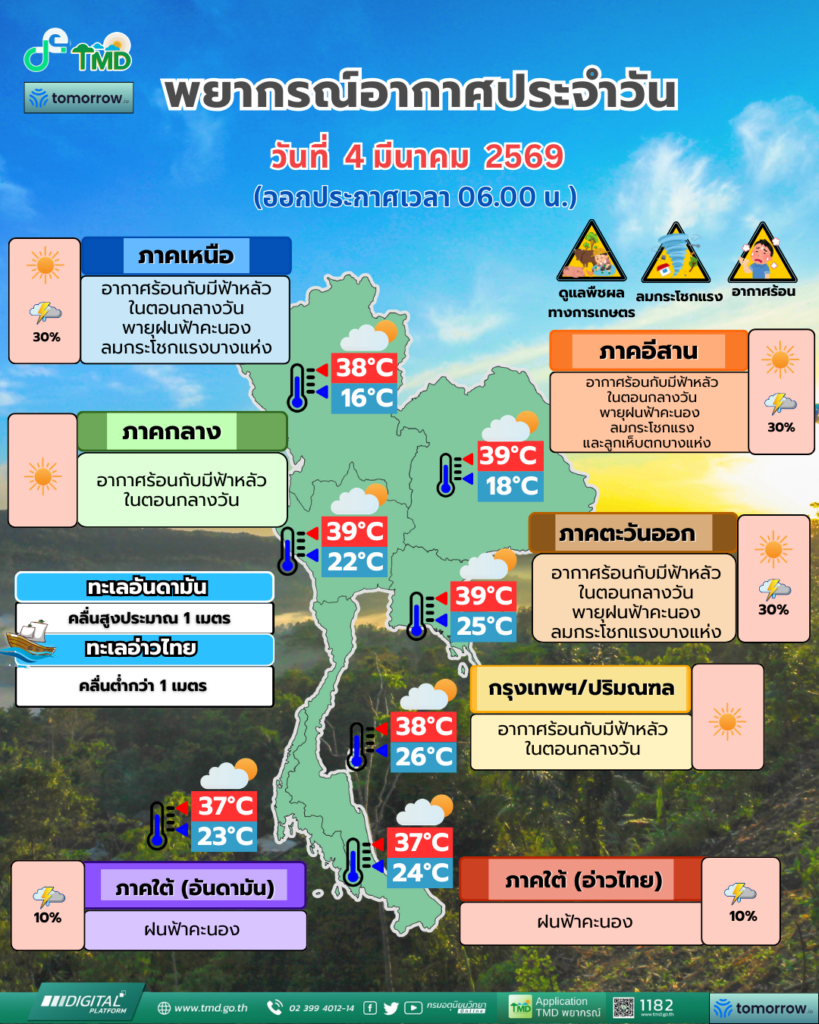 พยากรณ์อากาศ 24 ชั่วโมงข้างหน้า ภาคเหนือด้านตะวันออก ภาคตะวันออกเฉียงเหนือ และภาคตะวันออกจะมีพายุฤดูร้อนเกิดขึ้น โดยมีลักษณะของพายุฝนฟ้าคะนอง ลมกระโชกแรง รวมถึงฟ้าผ่าที่อาจเกิดขึ้นได้บางพื้นที่ ทั้งนี้เนื่องจากบริเวณความกดอากาศสูงหรือมวลอากาศเย็นจากประเทศจีนแผ่ปกคลุมประเทศลาวตอนบน และประเทศเวียดนามตอนบนแล้ว คาดว่าจะเคลื่อนเข้าปกคลุมภาคตะวันออกเฉียงเหนือและทะเลจีนใต้ในวันนี้ (4 มี.ค. 69)