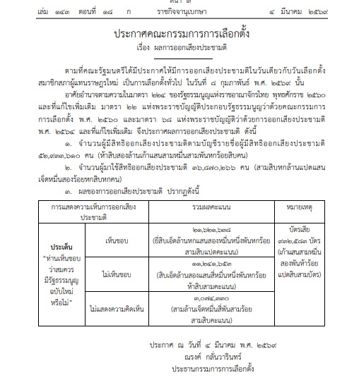 ผู้สื่อข่าวรายงานว่า เมื่อวันที่ 4 มีนาคม 2569 ราชกิจจานุเบกษา ได้เผยแพร่ ประกาศคณะกรรมการการเลือกตั้ง (กกต.) เรื่อง ผลการออกเสียงประชามติ มีนายณรงค์ กลั่นวารินทร์ ประธาน กกต. เป็นผู้ลงนาม