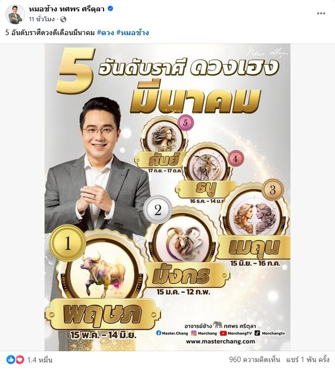 หมอช้าง เผย 5 อันดับราศีคนดวงเฮง ดวงดีเดือนมีนาคม