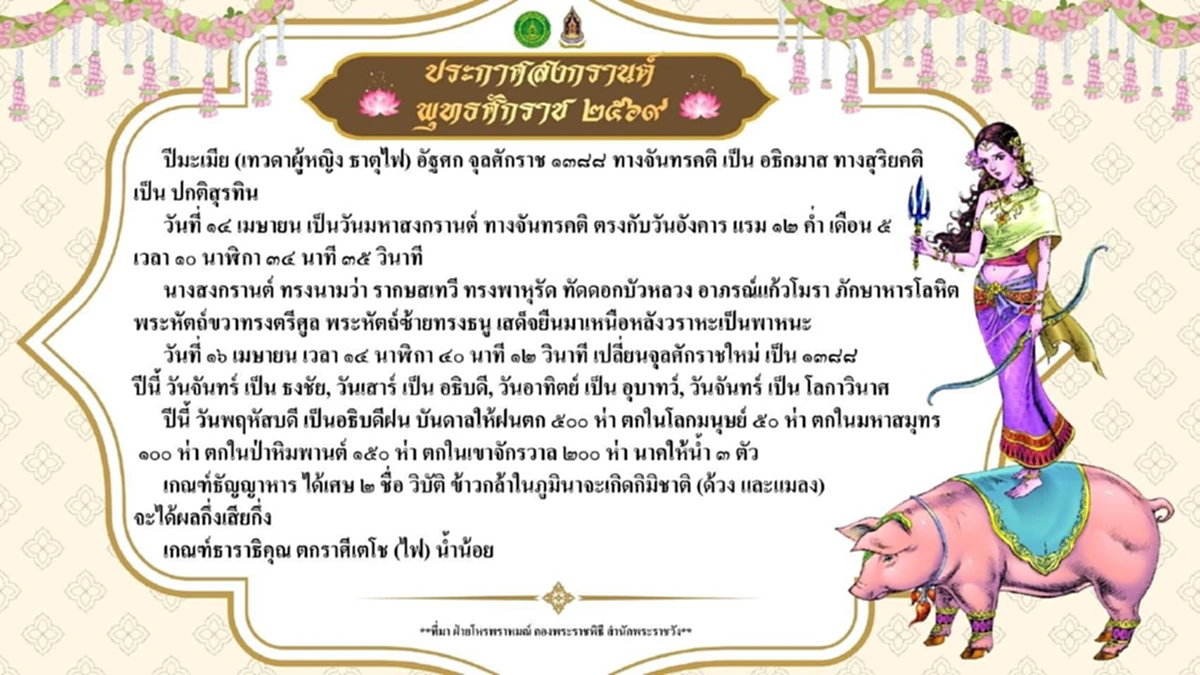 เปิดคำทำนายนางสงกรานต์ 2569 นาม "รากษสเทวี" ทรงตรีศูล-ธนู เสด็จยืนมาเหนือหลังวราหะเป็นพาหนะ เตือนสิ่งที่ต้องระวัง