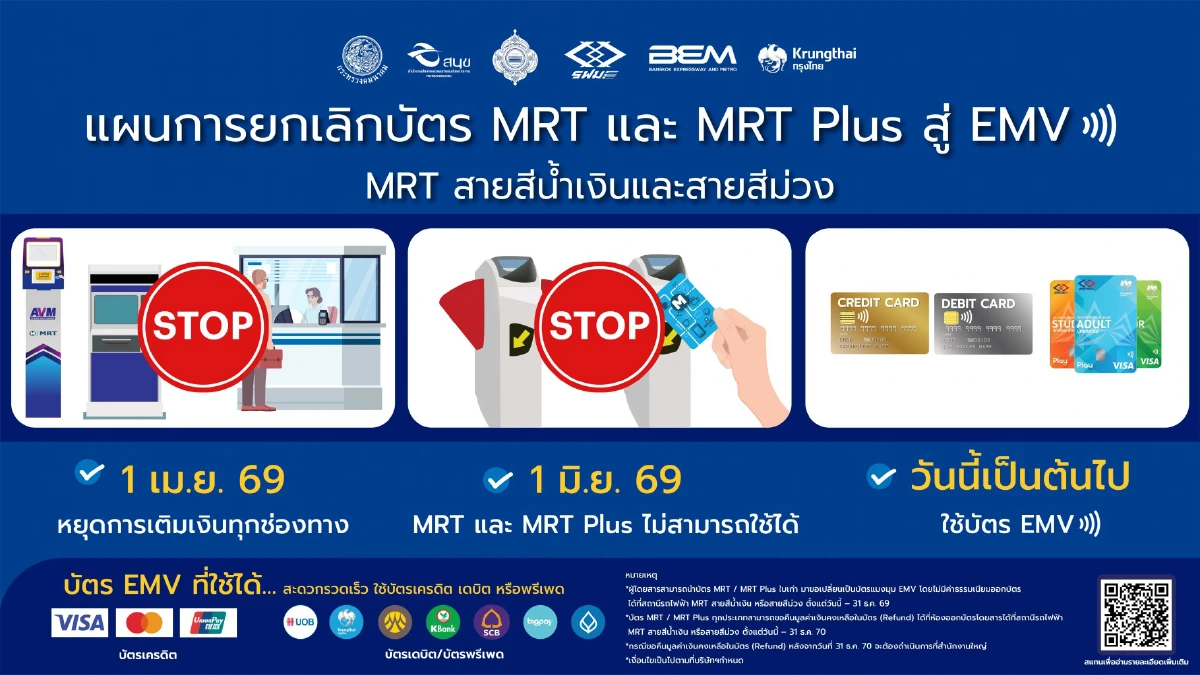 BEM เปิดขั้นตอนเปลี่ยนผ่านบัตรโดยสารรถไฟฟ้า MRT สายสีน้ำเงินและสายสีม่วง เดินหน้าขานรับ พ.ร.บ.ตั๋วร่วมของภาครัฐ ยกเลิกบัตร MRT/MRT Plus เป็น EMV Contactless ตั้งแต่ 1 มิ.ย. 2569 เป็นต้นไป