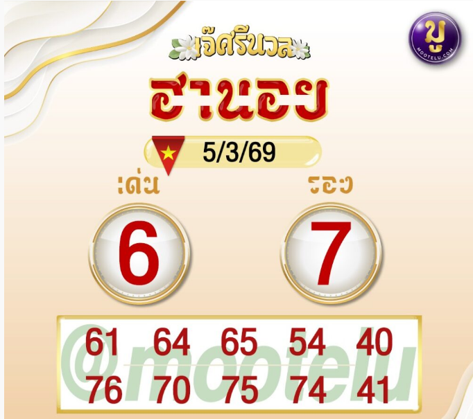 งวด 5/3/69 จุดเด่นอยู่ที่เลข 7 เพราะชนหลายสำนักชัดเจน โดยเฉพาะ 76 และ 37 ที่ปรากฏทั้งจากสำนักและ AI ใครเน้นเล่นเลขชนต้องมีติดโพยไว้ ส่วนสายกันพลาดเสริม 36 หรือ 61 เพิ่มความสมดุลได้ค่ะ ขอให้โชคดีรับทรัพย์งวดนี้นะคะ ✨