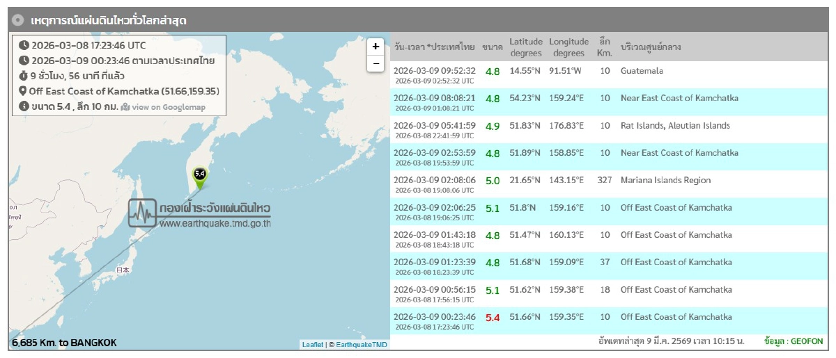 ขณะที่เมื่อไปดูสถานการณ์แผ่นดินไหว วันที่ 9 มีนาคม 2569 ตั้งแต่เวลา 0.00 น. - 10.20 น. ว่าตามเวลาที่รายงานมานั้น เกิดเหตุแผ่นดินไหวทั่วโลกเกิดการเขย่ารุนแรงในความสั่นมากถึง 5.4 แมกนิจูด พื้นที่ Off East Coast of Kamchatka