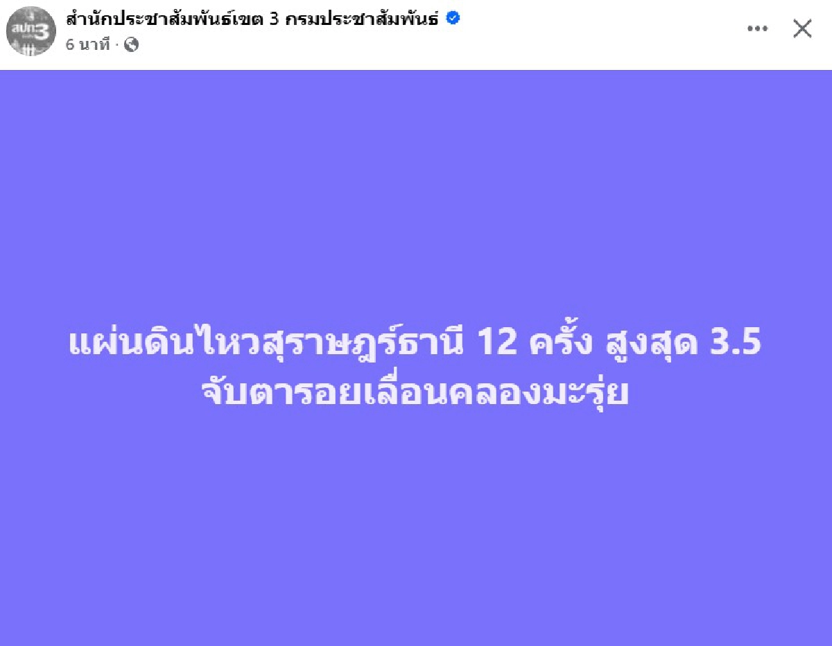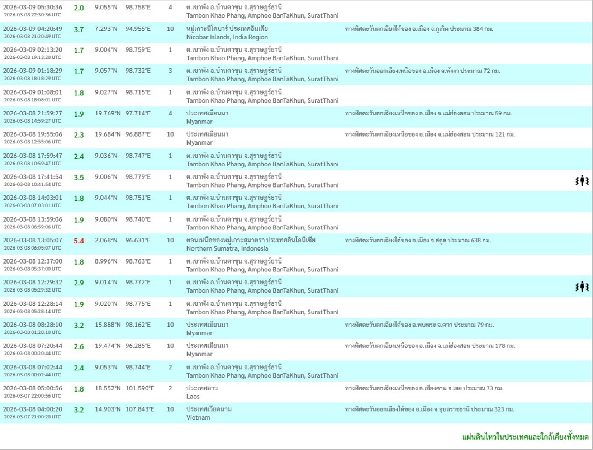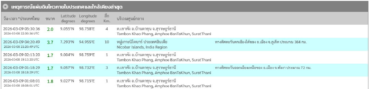2026-03-09 05:30:36 | แรงสั่นสะเทือนขนาด 2.0 แมกนิจูด ลึกลงไปใต้พื้นดิน 4 กิโลเมตร ต.เขาพัง อ.บ้านตาขุน จ.สุราษฎร์ธานี
