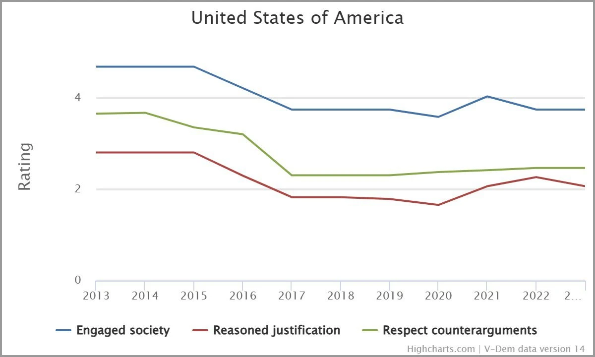 นอกจากนี้ คุณภาพของประชาธิปไตยในสหรัฐลดลงอย่างมีนัยสำคัญในช่วงทศวรรษที่ผ่านมาตามการอ้างอิงของงานวิจัยของ Varieties of Democracy Institute (V-Dem) ในปี 2023 ทั้งหมดส่งผลให้ประเทศประชาธิปไตยอื่นๆ เริ่มหันไปพึ่งพาตนเองและพันธมิตรในภูมิภาคมากขึ้น นอกจากนี้ยังพบว่าการถกเถียงทางด้านการเมืองในสหรัฐนั้นเป็นการถกเถียงที่อยู่บนพื้นฐานของข้อมูลน้อยลง