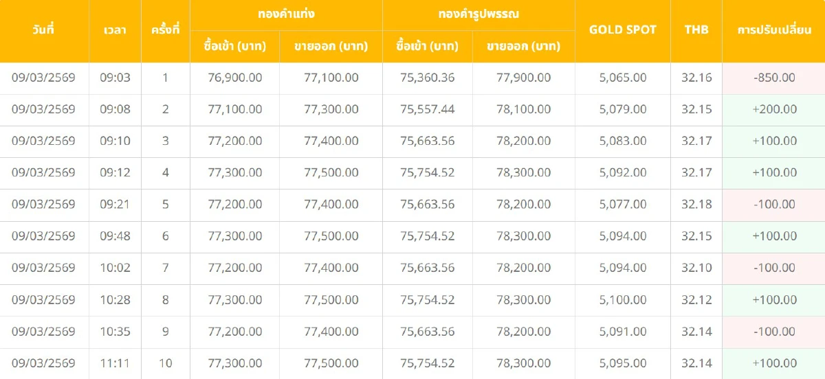 ที่มา : ราคาทองวันนี้ (9 มี.ค. 69) ปรับ 35 ครั้ง ล่าสุด ปิดตลลาด ลบ 350 บาท