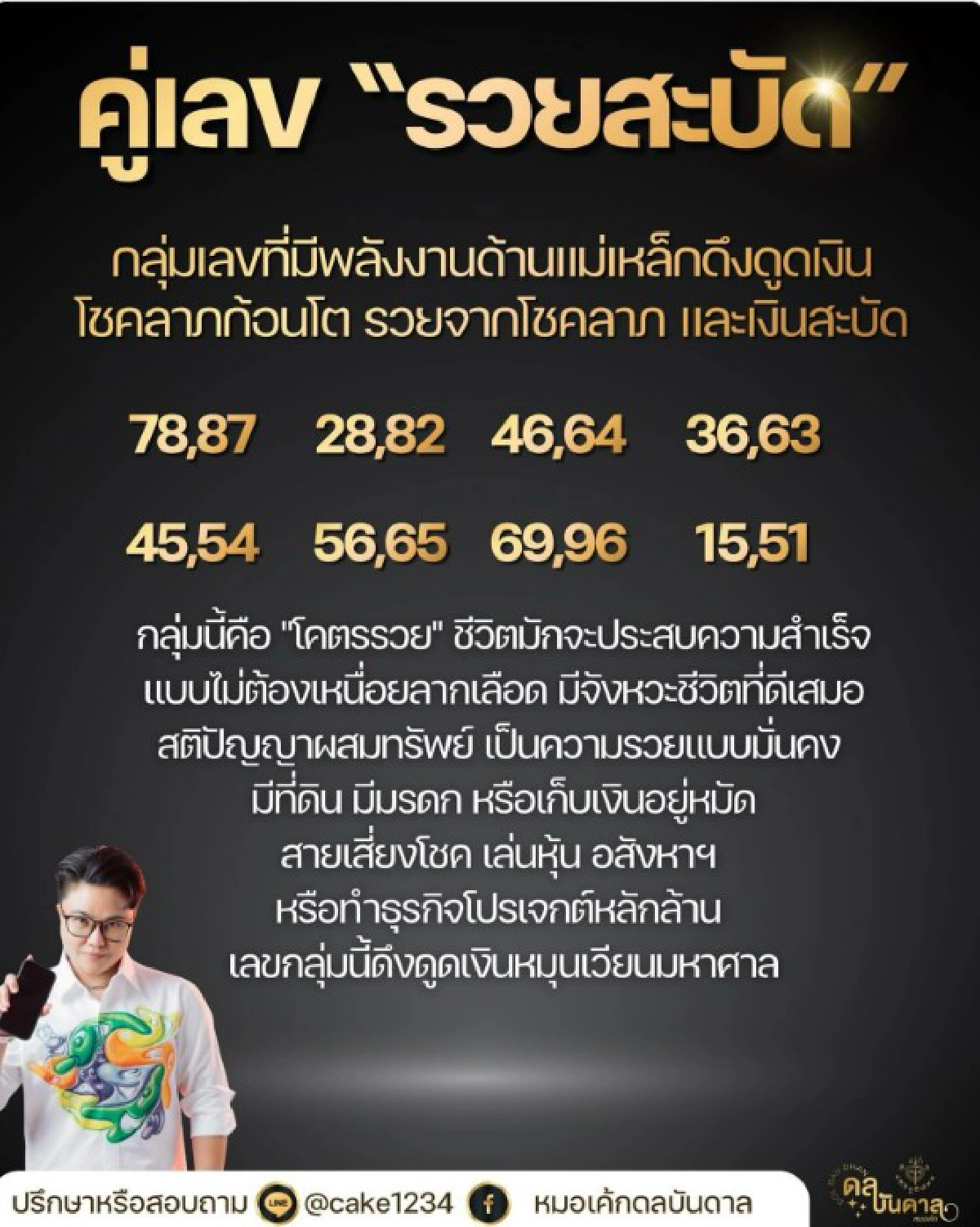 เปิดตำรา คู่เลขรวยสะบัด ได้แก่ 78, 87, 28, 82, 46, 64, 36, 63, 45, 54, 56, 65, 69, 96 และ 15, 51 ซึ่งเชื่อว่ามีพลังดึงดูดทรัพย์สินและโชคลาภ ทำให้หลายคนแห่นำไปเป็น เลขเด็ด เลขมงคล และเลขนำโชค สำหรับลุ้นรางวัลในงวดต่อไป