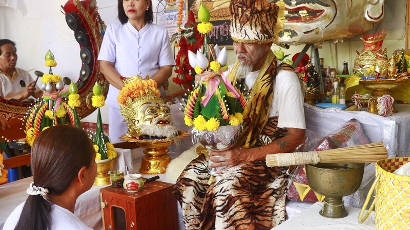 ปีนี้ก็เช่นกัน ได้จัดประรำพิธี ตั้งเครื่องเซ่นไหว้ แก่ครูบาอาจารย์และเทพยดาฟ้าดินตามความเชื่อ ไม่ว่าจะเป็นอาหารคาวหวานต่าง ๆ ผลไม้หลากชนิด รวมถึงหัวหมู จำนวน 32 หัว เพื่อนำมาเป็นเครื่องเซ่นไหว้ ในพิธีไหว้ครูดังกล่าว