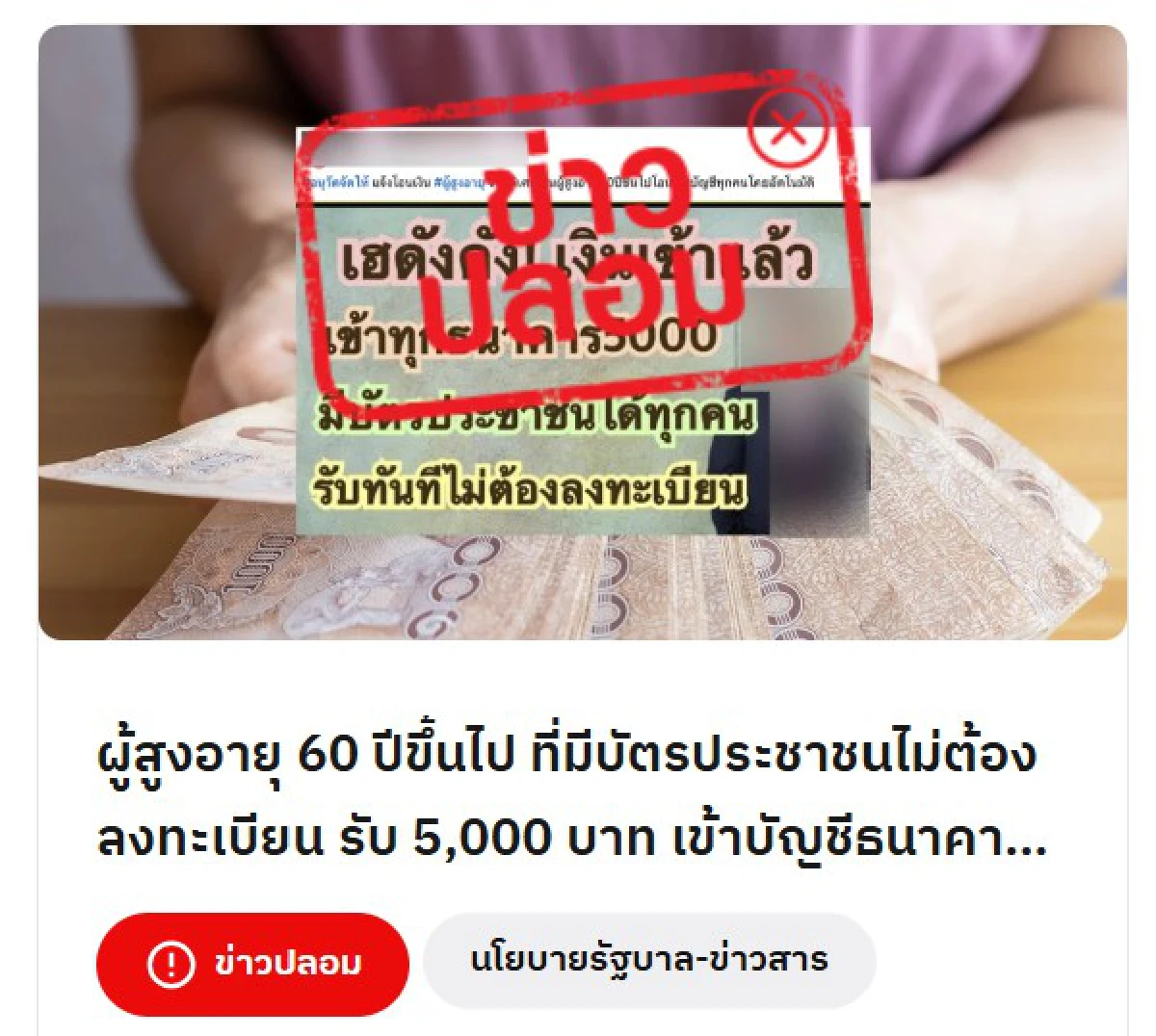 ที่มา : พม. แจงข่าวปลอม ผู้สูงอายุ 60 ปีขึ้นไป รับเงิน 5,000 บาท อัตโนมัติ ข้อมูลเท็จ