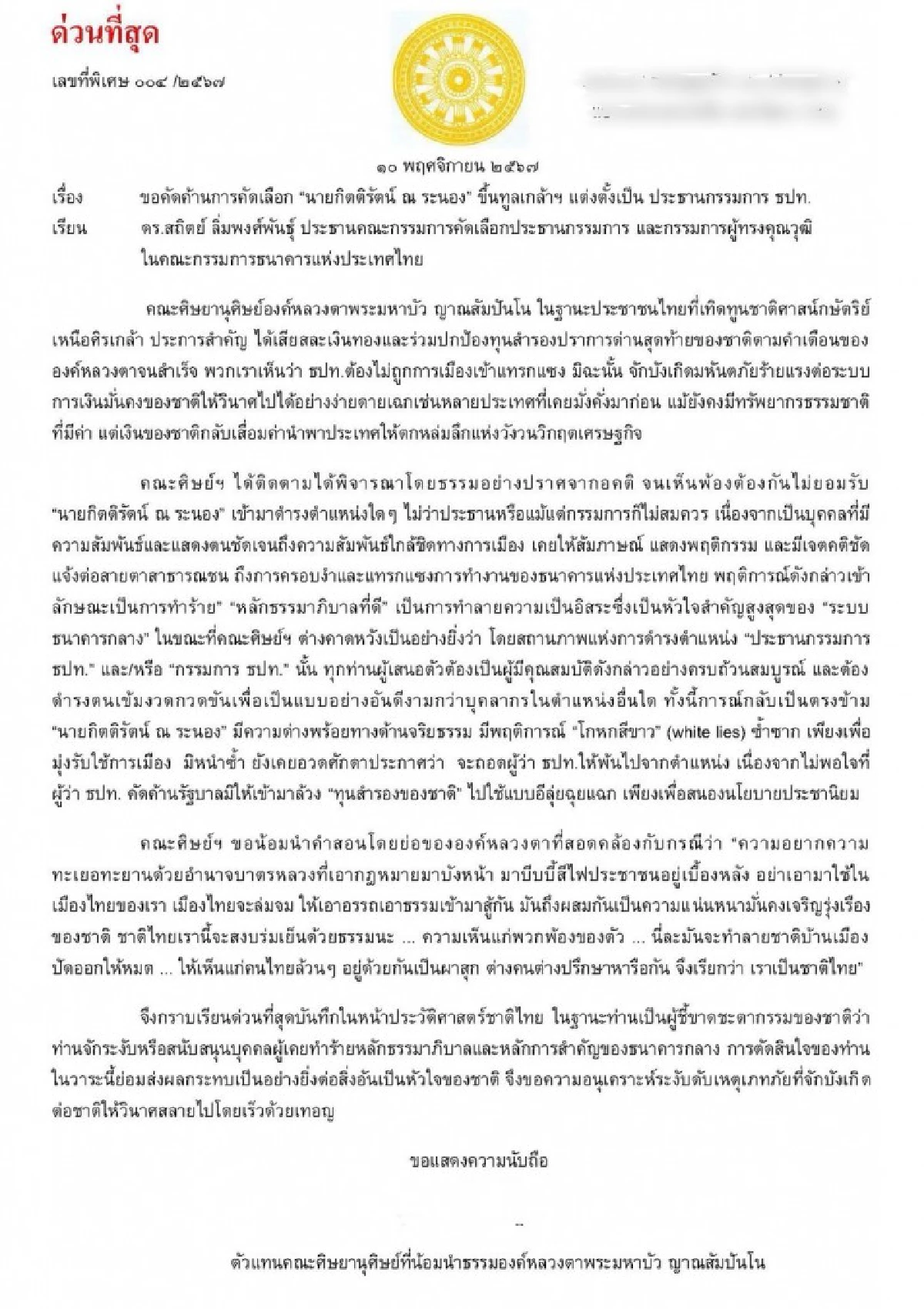 ตัวแทนคณะศิษยานุศิษย์ที่น้อมนำธรรมองค์หลวงตาพระมหาบัวฯ ยื่นหนังสือกับธปท.คัดค้านการคัดเลือก "นายกิตติรัตน์ ณ ระนอง" ขึ้นทูลเกล้าฯ แต่งตั้งเป็น ประธานกรรมการ ธปท